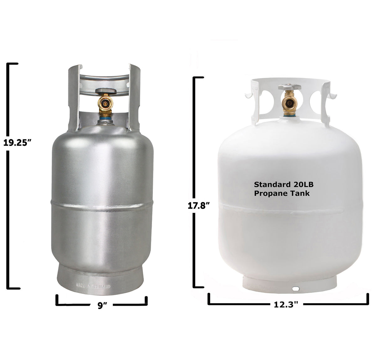 Your browser does not support our video.CORROSION-RESISTANT and RUST-FREE! The Flame King 10LB refillable propane cylinder is highly resistant to rust and saltwater corrosion. Tank is lightweight for easier lifting! Built from high-grade aluminum, this tank is lighter than the 10LB steel tanks, making it your best buddy for backpacking, camping and other outdoor adventures! This tank has a bright and shiny smooth finish and clean, dry and flake-resistant interiors. Also ideal for outdoor cooking, grills and BBQs, and torching. For your safety, this tank comes with an OPD valve to prevent overfilling. X-Ray and Hydrostatic Tested and DOT (Department of Transportation) and TC (Transport Canada) Certified so you can be sure to transport safely both in the US and CA. Weight: 10 poundsCapacity: 2.5 galDimensions: 9″W x 19.25″H
